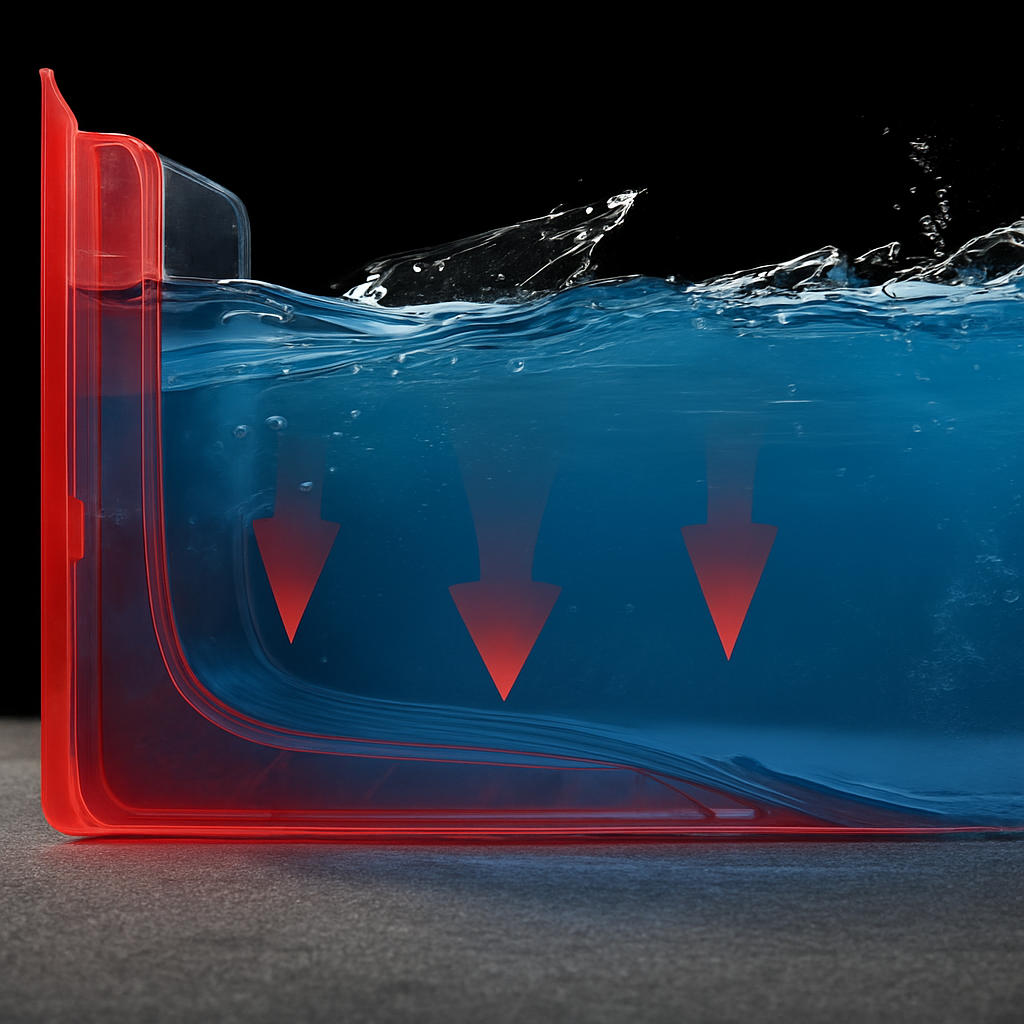 Bariera WaterShield została zaprojektowana w kształcie litery L, co pozwala na wykorzystanie ciężaru napierającej wody do dociśnięcia podstawy do podłoża i zwiększenia stabilności systemu. Gumowe uszczelki na spodzie i bokach ograniczają przeciekanie oraz poprawiają przyczepność, co sprawdza się nawet na nierównych powierzchniach.