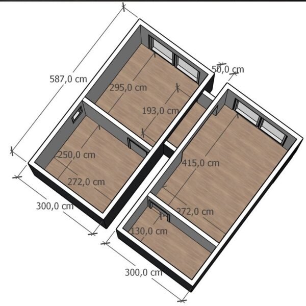 Dom modułowy 35 m² z salonem, kuchnią, sypialnią i łazienką. Dwa okna balkonowe, instalacje i wykończenie. Gotowy do zamieszkania, ocieplony i mobilny.
